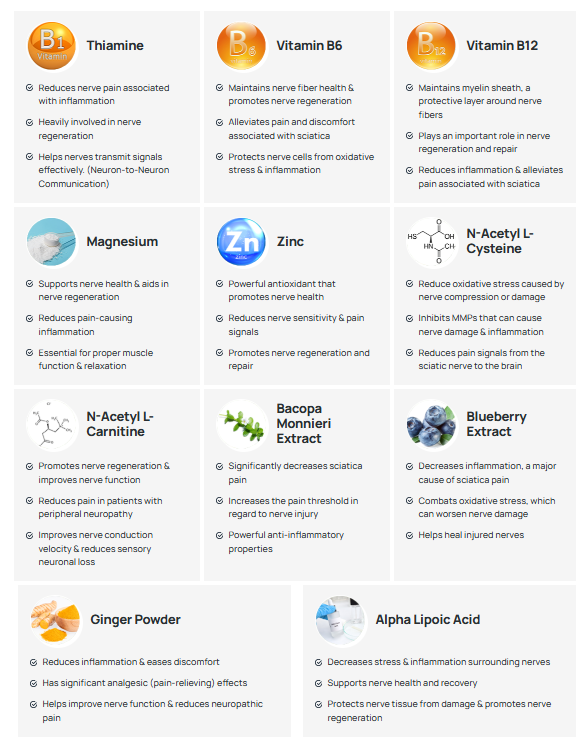 With daily use, Sciaticyl provides a carefully balanced blend of nutrients selected to support nerve health through multiple mechanisms. First, the formula is designed to help support healthy nerve signaling and comfort. At the same time, it contributes to inflammation balance and flexibility, which may play a role in everyday movement and physical ease. In addition, Sciaticyl includes antioxidants and essential nutrients that support overall wellness and nerve function.